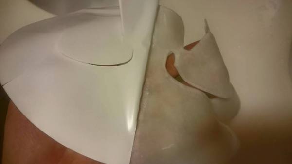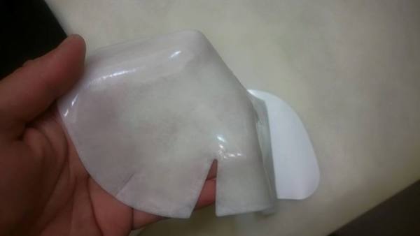 3. 將塑膠膜移除,將一層不織布結合透明凝膠狀的面膜貼到臉上