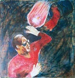 作為這幅圖本身的心理狀況是緊張,是整個生命的緊張。並不只是處於不如己意的狀況,即使是快樂如意的時候也是處於緊張的狀態下。街上奔馳的車子、星夜的隕石、、、知覺自身肉体「脆弱」的存在 ─ 這是最重要的點 ─ 要以自己脆弱的血肉之軀承受外在一切的撞擊,能受則受,不能受也得受,當然更寄望勝過它,或者說本能的「閃避」過它。