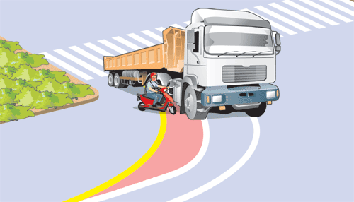 大型車輛在轉彎時,後輪的軌跡會比前輪短很多,但絕大多數民眾不知道大型車轉彎時有內輪差,以為前輪過了後輪也可以通過,就緊貼大型車旁,結果釀成慘劇。