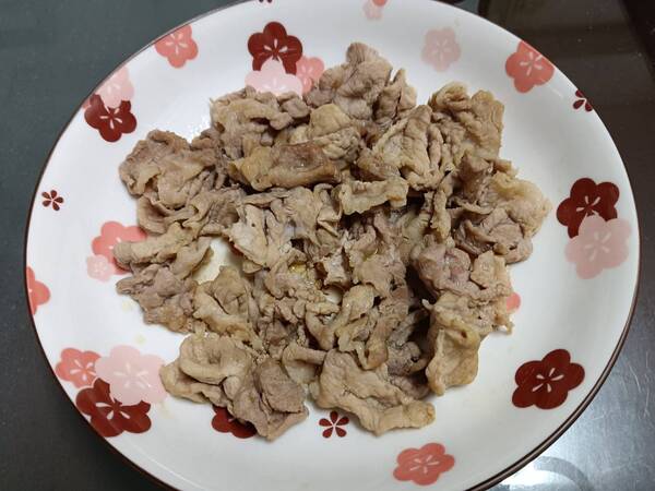 材料:全聯買的新鮮蓮藕片一包、全聯買的豬後腿心肉一盒、醬油、泰式酸辣醬(泰式甜辣醬)、白胡椒粉、熱水、蔥花。