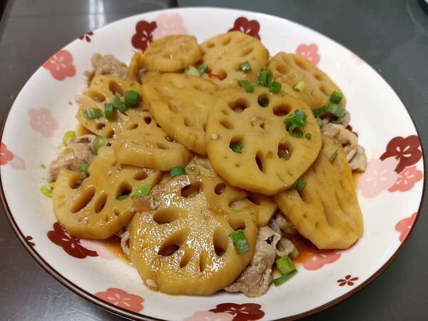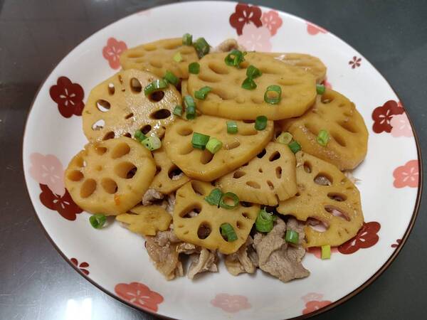 湯汁剩下少許時關火,撈出藕片與肉片放一起,撒上蔥花,再將湯汁澆上,讓蔥花被醬汁燙過即可。