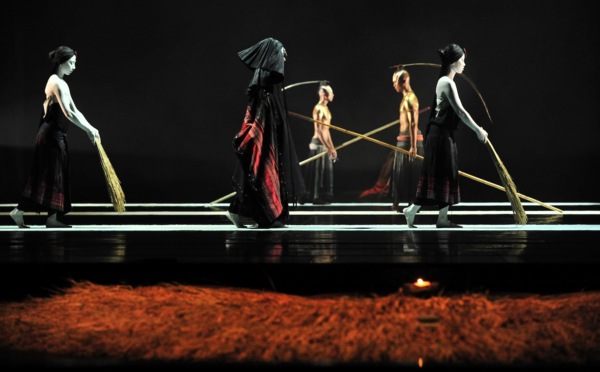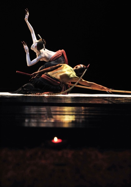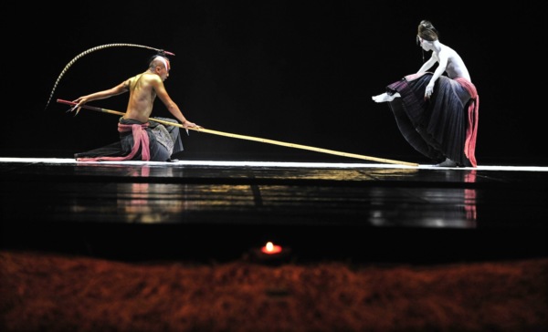我最喜歡的一段就是鷹族武士與白鳥私會的這一段,乍看,它像很多電影在拍情侶會面時飛奔會合時用的慢動作鏡頭,但《觀》更慢,慢得你感覺不出他們倆有在向前移動,但唯其極慢,蘊積的無形勁道更強,觀眾的期待越來越熱切,當舞台上兩人相擁時,觀眾的情緒也在瞬間獲得如火山爆發般的釋放。
