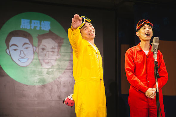 這個選秀節目叫《我是笑星—角逐夢想的小金盃吧!》,是果陀劇場主辦的【爆米花輕鬆劇場3.0】的節目之一,這回「達康.come」的表演還有另一個特色是有日本漫才組合加入,這個名為「漫才少爺」的團體,是日本吉本興業派到台灣來發展的藝人,「去年我們辦『漫才塾』時,他們有來看演出,後來要求要旁聽後面兩期的課,並跟學生一起演出。」就這兩台日兩個漫才團體就建立了關係,「這回我想找他們一起合作演出,給觀眾一個新的口味。」