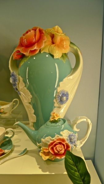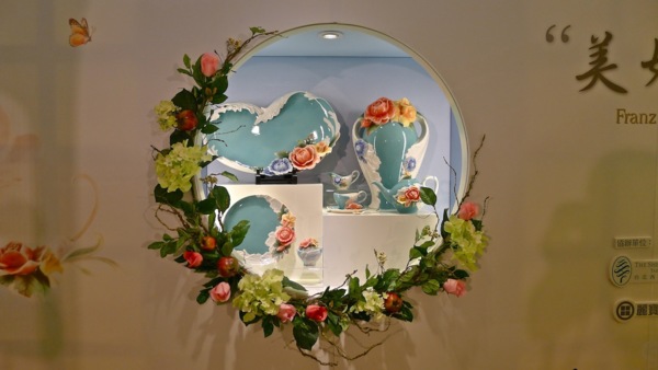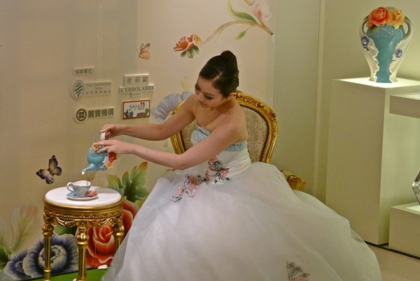 這套作品包括茶壺、茶杯、盤子及花瓶,畫中龐畢度夫人穿的粉藍色有白色蕾絲邊的晚禮服,設計師張譽瀛很巧妙地把這些元素使用在設計中,看起來是瓷器,卻仍保留晚禮服的模樣,而兩者又不衝突,彷彿看到龐畢度夫人婀娜的身影,穿梭在凡爾賽花園的派對賓客中。