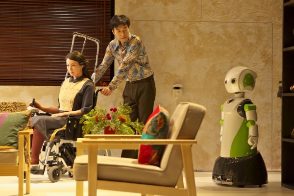 這是很特別的一齣戲,由機器人、人形機器人與人類一起演出,所謂人形機器人,就是外表做得跟人一樣,根本看不出來是機器人,劇中坐在輪椅上的就是人形機器人,它是由日本科學家石黑浩以科技複製人類心理及生理機能打造而成。