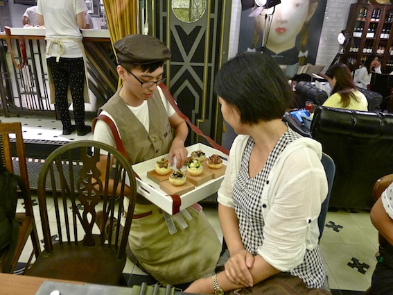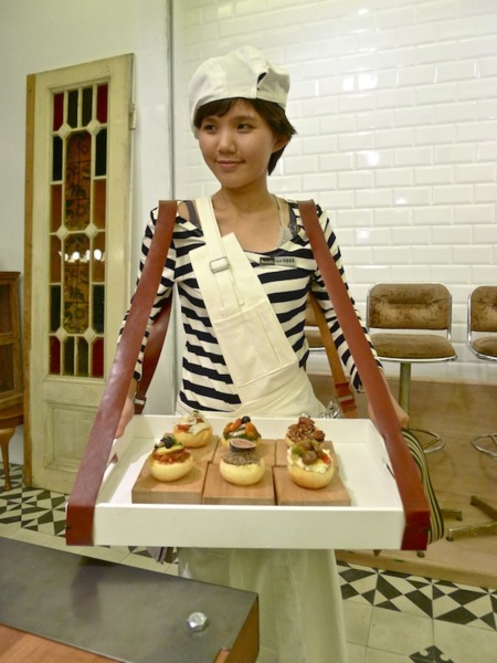 廚房是舞台,前台也是,你可以看到用皮帶撐著托盤、裝著各式各樣的點心,打扮得像是早期火車站或電影院賣小食的小販,穿梭在客人間,他們的服裝很特別,戴著鴨舌帽,穿著復古的背心圍裙造型,男的就像一次世界大戰的報童或工人,女的像當時的戰地護士,《戰地鐘聲》的場景瞬間在腦海裡浮現。