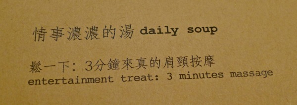 喜歡作怪的Grace在菜單裡加了一項應該是台灣餐廳獨有的菜:「按摩。」菜單上這首菜的名字叫「鬆一下」,菜的說明是「3分鐘來真的肩頸按摩」,真的按摩哦!而且是《好樣情事》的服務人員幫你按摩,他們為了這道菜,已經練習很久了。