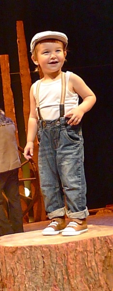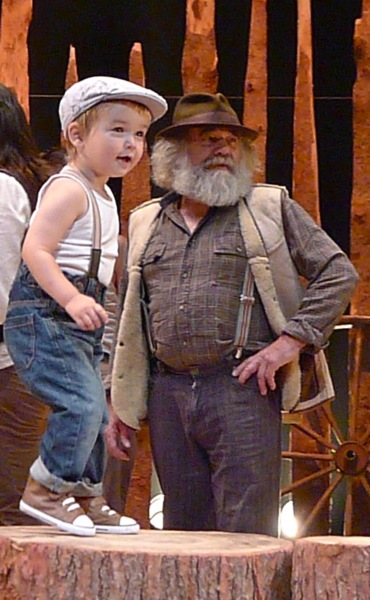 「所有舞台道具及佈景都是爸爸做的。」安東說:「舞台場景是座隱藏在林間的大木屋,其實就是我爸媽在林場裡的木屋。」《伐木樂園》這個作品的靈感其實就是從這座木屋產生,他們每天排練前都會先在後院比賽鋸木頭暖身,再找周遭的器具、材料來發展演出內容。