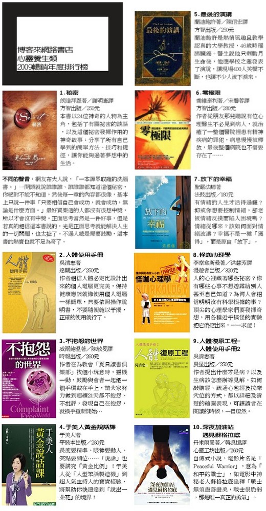 觀察「博客來網路書店」的2009 年「心靈養生類」書籍排行榜,會發現「養心」書比「養身」書更受歡迎,包括「秘密」、「零極限:創造健康、平靜與財富」、「最後的演講」、「深夜加油站遇見蘇格拉底」等書,不約而同強調「心靈的力量」。