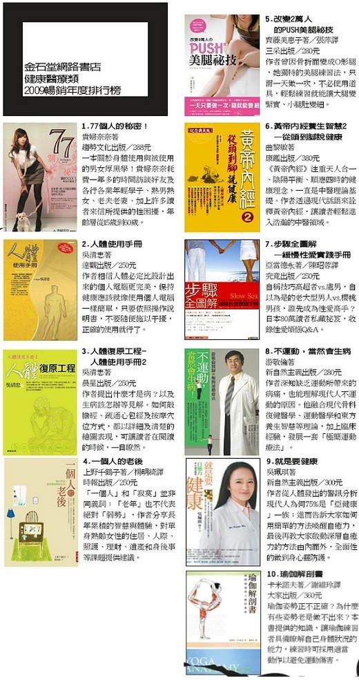 養身書方面,過去「告訴你要怎麼做」的醫療書,轉向「告訴你為什麼要這麼做」。2006 年推出的「人體使用手冊」,是念工程出身的吳清忠,患病時讀古代醫書「黃帝內經」的心得,他認為保持健康應該就像「使用個人電腦」一樣簡單.只要了解人體的組成原理,再依照操作說明書正確使用就行了。