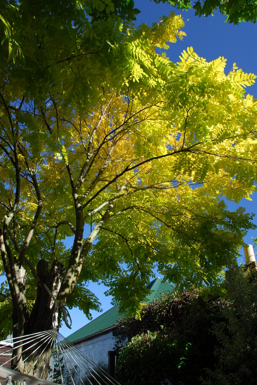 這是她要送為女兒作嫁的拼布床罩,連同那個錦囊長偈,雖然女兒姻緣還未至,她似乎已迫不及待的想要讓女兒也懂得將心作嫁,也懂有佛又名替身可代人息憂消愁絕災解厄。此時她放下手中的針線活,忙著打電話邀約她先生的兄弟們,週日下午喝咖啡,這個心意已然俱足六度。在家修行雖然還是閒話幾句,這和未嫁前盡是八卦已是不同。打完電話,她信步走到後院躺在吊床上,低吟著:「凌霜雕紅粧 躬身數千嬌 曾經翠綠色 無有幾時遙 舉目無陡峭 放眼眾山小 識得清淨身 方寸亦廣邈」此時眼前的黃金雨樹映著夕陽,葉葉金黃迎風閃閃---------。