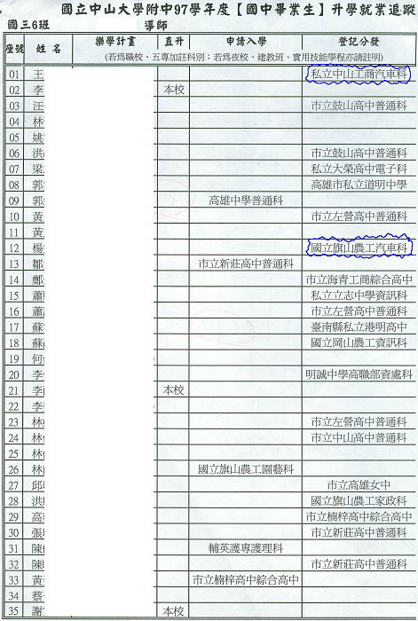 請參閱附件12:中山大學附中97學年度國三6這一班2位學生就讀汽車科