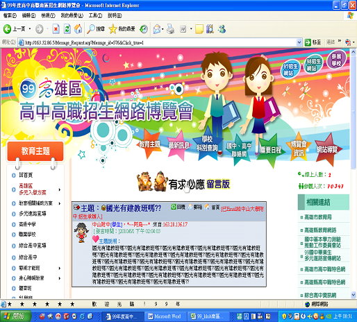 11.高雄區高中高職招生網路博覽會網頁中留言板留言「國光有建教班嗎???」(99年):顯示對國光中學之職業類科(汽車科與資處科)有興趣。中山大學附中「校務發展」方向應朝汽車科老師建議案「A案(『回歸本校開辦綜合高中前之學制「普通高中附設職業類科(汽車科、資料處理科)」』)」。連結留言板 http://163.32.86.5/Message_Request.asp?Message_id=576&Click_true=1