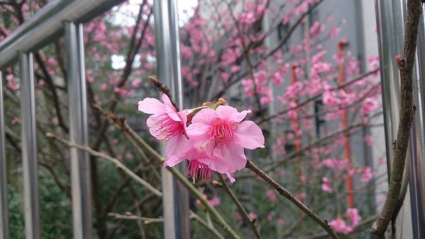 山櫻花,別名緋寒櫻,在台灣是屬於常見又最早開花的品種,花瓣基本有5枚單片,三朵花為一簇,顏色為桃紅色,形狀呈垂釣鐘狀。由於數量眾多,因此是最容易觀察的櫻花,盛開的時候在枝條上呈現垂落的模樣,像似許多桃紅色的鐘鈴掛在樹上。