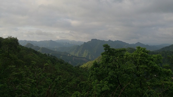偶然在山崖上拍下了非常壯闊的景色,微弱的陽光在雲層的縫隙放射,將光線微微的照射在遠處的山谷間,在一片翠綠色的樹林中凸顯了微微的金黃色的光輝。