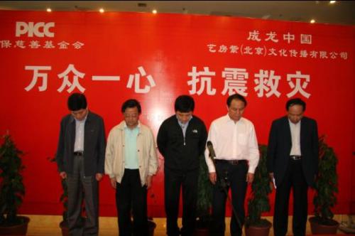 成龍先生到達成都後立刻在人保大廈舉行了記者會,決心為災區重建學校。當成龍大哥得知災區目前急需方便食品時,馬上邀集了由他代言的廠商,如可口可樂、思念等食品企業一起捐贈物資,此次帶來的物資有12萬瓶原葉茶和價值100萬元的思念米線和粽子。