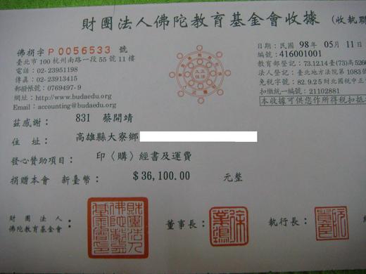 感恩網海中以及各道場法友的支持.在一個月內隨即募款圓滿.狗狗已也款項匯給"佛陀教育基金會".其單位也將收據寄給狗狗了.在此將此二照片貼出來.以玆公告!!