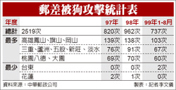 其中被犬隻攻擊次數最高的高雄鳳山郵局投遞股共有一百零五名郵務士,投遞股估算,郵務士被狗攻擊次數每年大約三到四次,多數兇手是鳳山區的家犬,不過流浪狗傷害程度較嚴重,去年中曾有郵務士被流浪狗咬傷小腿流血案例,當事人因此休息了好幾天。