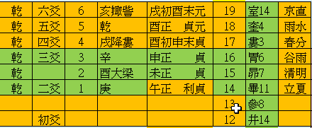 乾六爻,別為二体,外体三爻定時位,內体三爻定星次,時位酉。九四、酉初。九五、酉正。上九、戌初。星次大梁。九三、胃六度,春分之終。九二、昴七度。古曆谷雨之終。初九、華十二度。古曆清明之終。由外体之時位為酉。則知內体大梁星次所處者為兌之未申。由內体之星次大梁,則知外体酉位上所重者乃震之娵訾與降婁。陰陽合曆,曆元至朔齊角,起於艮之初爻牽綷初度,故至乾之大梁,九三為周乾四月(夏朝二月),十八日。九二為五月初三日 初九為五月十八日,以後逐年變化,乾坤乃相對之卦,乾次在未申、位屬下午。坤次在丑寅,位屬下半夜,有時卦爻相對互用,不可拘泥,乾之原位在酉,而酉正為日落之點。古人夜觀中星之所據。又星次屬夏曆三月節氣,依天道序列,亦正在酉,故經以乾為首,乾為八卦之一,周天之一部份,非有特殊之崇高義。惟其時位酉則極重要耳,學者以六爻為純陽,又稱為天,一若乾高於其他七卦,而發為種揰空論,積非成是,遂滋淆惑。元亨利貞乃時位之座標,所以一日之時區,別周天之象限,
