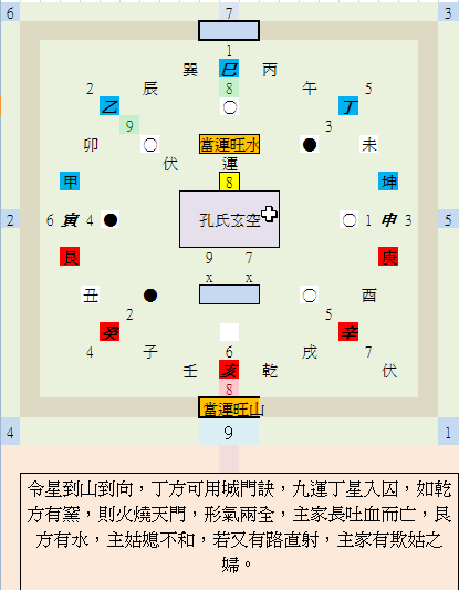 孔昭蘇:令星到山到向,丁方可用城門訣,九運丁星入囚,如乾方有窯,則火燒天門,形氣兩全,主家長吐血而亡,艮方有水,主姑媳不和,若又有路直射,主家有欺姑之婦。