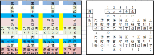 本例為水木食神格,局中甲木為食神星,火為財星,因此生活在台灣這種較熱的地方有著相對的優勢。命盤中壬水日主14度,甲木食神20度,地支辰之中各有三度丙火,天干為金水木順局,好在金不剋木,水不剋火,所以食神,財星都保護得宜。全局剋洩得宜,食神格之中,日主和財星皆有氣,自然命格不低,本造財星不透,要富有,需要大運配合,甲午大運之後,木火透干,地支或助火,或不傷火,故財星得氣有助,與夫創業經營,財產逾億。讀者或許會想,何以9度財星分散在地支之中而能富有,這其中的原因有兩個,一是甲木食神透干,得金水相生,金水木源源不絕,接續相生而轉生火,在實務論命時,會把相生的力量考慮進來,也就是說原局有不斷生火的力量,火在時間的進行中,會越來越旺,這是由原命盤的相生來看。 另一個是大運的時間運行跟命盤的關係,本例甲木食神20度當然旺於一般人,壬水日主14度,又有辛金相生,已經符合〔日主有8度以上,並不低於格神二分之一〕,這樣的架構,日主已有足夠力量使用食神星,所以在考慮用神時,並不需要以扶助日主為用,這一點跟一般論命法不同,以前還沒將能量旺度數值化以前,食神格中到底食神星跟日主相差多少要扶日主,並沒有一定的標準,現在有數值表,就變的非常明確,只要日主不低於食神二分之一,加上有8度以上,一般用神用財星即可,本例就是這樣的例子,我們看大運的變化,甲午乙未大運,天干木能生火,地支午未六合而助火,當然事業錢財順利,丙申大運,丙火財星透出,賺錢機會更是明顯自來,申中火雖退氣,但不傷火,而且在台灣緯度,申中火有餘氣,因此此大運當然錢財順遂,丁酉大運,則屬守成之運。所以看此例格局大運,簡單可以判斷出,丙申大運前一路順暢,事業錢財越來越好,丁酉之後守成,命格為富格。文墨龍批於「三天學會算八字。」