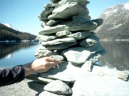 我們一直走到那堆紀念你的石堆前,你曾在這裡堆石,你走後,人們繼續,我們也繼續,尼采,石堆已很高了,那一顆由清澈湖水內撿出來的石頭由我們置於其上。
