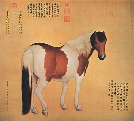 我非常喜歡現藏法國巴黎吉美博物館的「哈薩克貢馬圖」。描繪乾隆皇帝在圓明園內,接見前來進獻駿馬的哈薩克使節,皇帝和兩側的大臣都具有明顯的肖像特點,純熟的巴洛克風格融入中國繪畫技巧,且是橫卷拉開,令我百看不厭。在畫中,皇帝與臣子並無尊卑之分,臉部表情極為柔和,彷彿略為疲憊的面部肌肉剛剛才休息過,而馬當然是完美的馬。現今的西洋專家們說,此畫表現出義大利北方文藝復興後極力主張的個人尊嚴,光線的處理效法十五世紀前半葉的佛羅倫斯繪派……