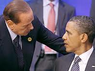 影顯示,貝魯斯科尼總理自行走向美國總統歐巴馬,將一手搭在歐巴