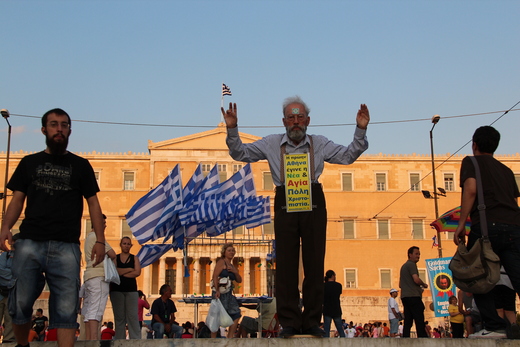 廣場上方便是國會,希臘總理帕本德里歐的頭像被製成一面大型海報,架在醒目之處,上面寫著「世銀年度最佳員工」 (Employee ofthe year),以茲嘲諷總理聽命於國際力量。更多市民在此聚集,愈夜愈熱鬧,大家聚在一起唱歌,舉手附議或抗議,或者更像出氣?一位叫亞歷山大普洛斯男人又唱又跳,活像在參加嘉年華會,但他說