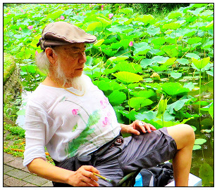 許大師身著印有自畫荷花的白衫,留著雪白落腮鬍子,