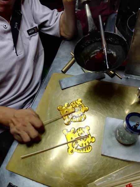 - 將液狀的糖倒在光滑的銅板上,趁其未硬化,畫出造型。