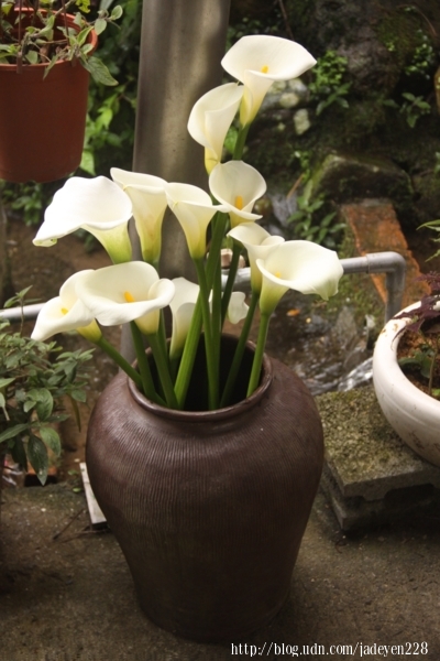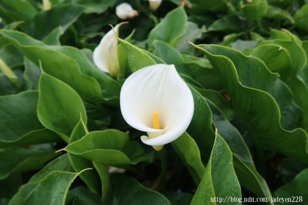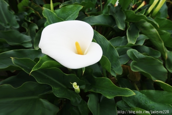 今年暖冬,海芋開花開得早,小部份的花瓣與葉子呈現枯黃。