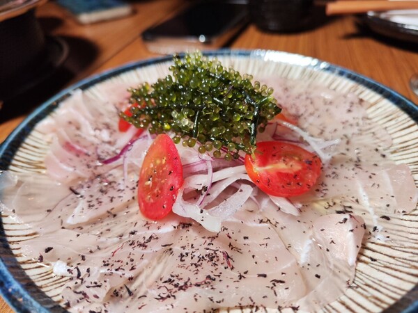 - 義式海葡萄涼拌魚生(Sea Grape and Amberjack Carpaccio):海葡萄又稱「綠色魚子醬」,是沖繩沿海特有的海藻,與新鮮魚生搭配,帶來清爽的海洋風味。