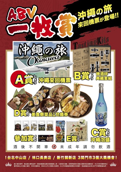 為了讓這場沖繩美食祭更加熱血,ABV日式居酒館同步推出「一番賞抽獎活動」,即抽即開,超值好禮等你來拿!