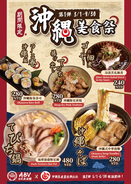 全台ABV日式居酒館(共有三間) 期間限定(即日起至4月底止)——沖繩美食登場