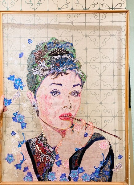 上圖圖說- 親糸大稻埕邀請藝術家黃莉莉(著白衣者)以「紗網刺繡」結合減廢布料,110公分的大幅創作前所未有,一針一線,一進一出展現優雅與自信的女性力量。