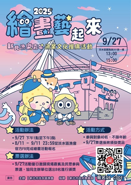 活動一「2025繪畫藝起來」9/27下午1點至3點在新北市淡水區觀海路201號 1 樓,邀請40 名(不限年齡)到現場畫畫。活動流程請先網路報名→9/27當天現場作畫 → 現場票選 → 選出 8 名優勝頒獎。報名時間即日起至9/11 23:59 之前,繪畫報名連結:https://docs.google.com/forms/d/16vprJtJda58GF6e7O8ZSnOqWYO0U4sRTpsrD6qDjlXA/edit