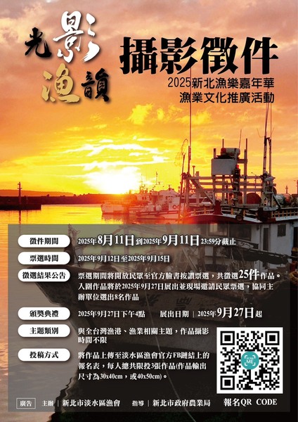 第二個活動是「光影漁韻攝影徵件」,報名時間即日起至9/11 23:59 之前。主題請與台灣漁港、漁業有關,每人最多投稿 3 件(30×40cm 或 40×50cm)。徵件連結:https://docs.google.com/forms/d/e/1FAIpQLScqzufxHgleJU0qmzq9eNeiFGpt-vcEQSrqXzuq5yJi4qj-9g/viewform?usp=header