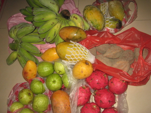 這一晚,和兒子們吃力地捧回這一大堆水果地瓜,其中的芒果是舅