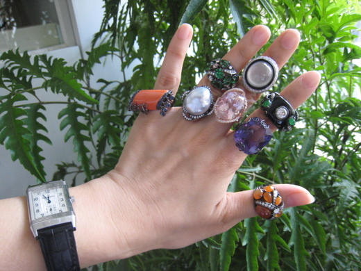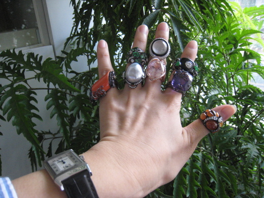 突發奇想,把香香設計的諸多高檔戒指作品全戴在手上,