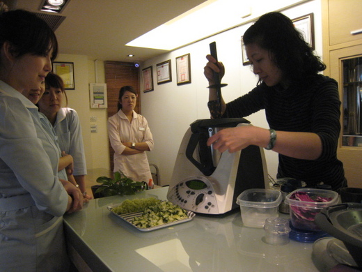 當天,從早上十一點至下午一點半間,她一共做了四種生菜沙拉切碎與白芝麻醬汁製作、全麥麵糰的揉成、然後全麥饅頭的製作蒸煮與豆漿同時完成、單機炒出米粉、好喝的濃濃南瓜湯、咖啡粉現場研磨與現煮熱咖啡等,非常有趣,詳細過程可至「我的相簿」中找到相關圖片。