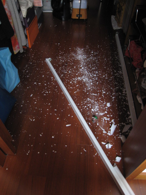 日光燈管不想活了(其實是我的錯。前些日子,有次拿上層的東西時,勾到了電線,當下就有一根日光燈完整地掉下來,沒碎,剩這一根,也許,它已不太穩),自己從高高的上頭摔了下來,玻璃碎片掉滿地,忍著全身無力,仍得勉強打掃一番。