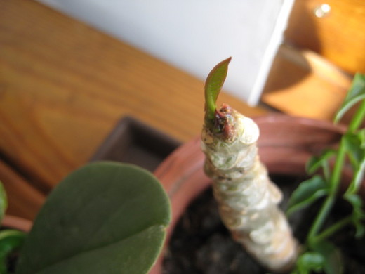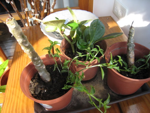 過年時訪友,沒想到,她的院子裏截下好多根雞蛋花的短短枝幹。賞了我兩小盆、兩大枝,兩大枝因為彼時不懂、愛樹心切、以為給水喝是必要的,天天澆水,結果被我澆爛了根,好生氣餒。後來打電話問友人,她驚呼,雞蛋花耐熱、耐乾、久久澆一次就好(七至十天,視乾燥程度)。