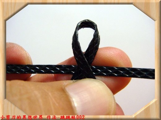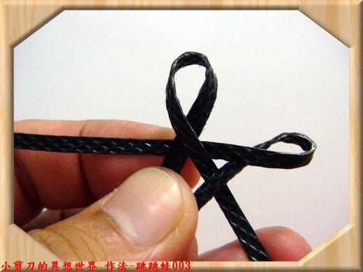 c.右側打包帶(二)往下繞個圈圈,壓住打包帶(一)之右腳。詳圖作法-跳跳蛙003