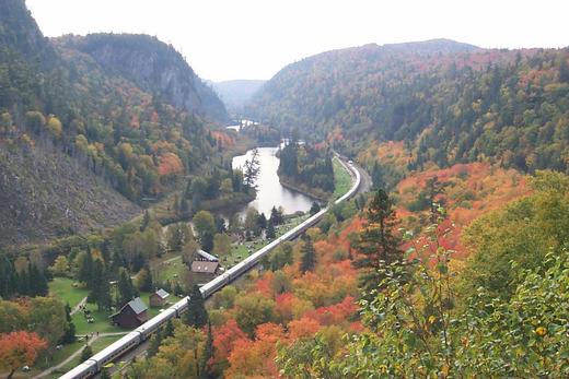 車行約兩個半鐘頭後,在山上的亞加華峽谷停車,整列火車將近一千五百名乘客蜂擁而出,散入在楓紅片片的峽谷之中。在峽谷中心有一平如明鏡的大湖,此湖四面環繞著或是濃粧、或是淡抹著霜紅的群山,澄清的湖面倒映著五顏六色的山峰,剎是奇觀。我們沿著懸崖壁上的斜徑爬到山腰上俯瞰峽谷,真如置身於仙境之中。回到山谷的楓林裏,楓樹頂端的葉子因有較多的陽光,是深紅的顏色,下面的葉子漸由淺紅轉為淡黃。淡薄的秋陽穿透樹林,葉子變成半透明,葉脈清晰可見,走在其間覺得天地間似乎掛上了粉紅伴淡黃的紗帳。小徑上則舖滿了五顏六色的楓葉,踏在楓葉上沙沙作響真是詩情畫意。走出楓林,山麓旁水聲潺潺的小溪上飄流著片片紅葉,使人想起唐朝宮女紅葉題詩的詩句: 流水何太急 深宮盡日閑 殷勤謝紅葉 好去到人間