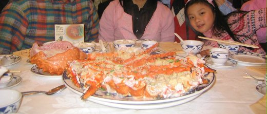 工作之便, 應酬不少, 倒也嚐過不少佳餚, 有時一星期最高外食五天,最後是有一點食不知味,不過, 值得推薦的美食: 帝王蟹, 每年二月底開始是帝王蟹最豐盛產期,此時價位也從一磅加幣25元以上, 降至12元, Vancouver 的新瑞華, 應是來這兒人們無人不知的餐廳, 通常調理帝王蟹有BBQ,椒鹽,清蒸,蒜蓉,---, 但大家都喜歡用蒜蓉, 香氣又能吃到肉質甜味, 是物超所值! 一家人圍桌大啖美食佳餚,溫暖而幸福, 儘管外面仍是零度左右.