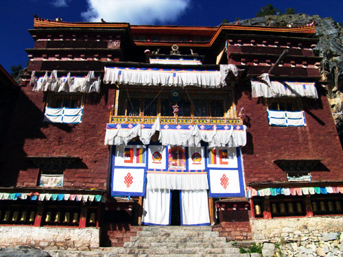 Tony抓住陽光,快速拍下了寺廟的全景圖,我們便爬往依山而建的側門方向,穿出側門,即是寺外,向上是僧侶們的居所,居所之下有零星的平民住戶,隨性堆疊的矮石牆上置放著材火,旁邊生滿紅橙的太陽花,這時竄出一隻小豬仔,咚咚咚地胡亂鑽進花叢間,很是可愛;向下左邊,可以見整排繞著寺廟的轉經筒,我們看著轉經筒座下被前人磨過的木軸痕跡,作為判斷該項哪個方向推動轉經筒,深怕推錯方向讓經文倒著唸,後果不知如何。由外繞到寺前,看見幾位皺紋滿佈的老人坐著聊天,我們以為可以問到方便的地方,沒想到彼此無法以漢語溝通,順著所指的方向找去,並未發現目標,只看見幾間快頹圮的土磚屋,我們只好放棄,車駛離開一段路程後,Tony遠遠地將這個依山而建、神與人為鄰的寺院照下來,我們發現在寺廟上方的岩壁高處還有一間藏屋,在後來的寺廟參觀中,我們推知那應該就是喇嘛高僧住所或閉關修行的地方。