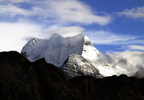 最後,我們只好從「亞丁國家自然保護區」管理局大門購票進入,在此之前均為水泥路面,愈往山裡行進,馬路開始變為碎石路面,但是還算平整,繞山轉了好幾個彎,突然在一次盤山旋轉後,我們幸運驚訝地見到亞丁第一高山「仙乃日」,兀自靈氣仙骨聳立,就如同大士端坐蓮花之上,照得天藍山白,不言而威、不語而慈,雖然我們不能按照自己心裡規劃的路線走頗有悵然,但是能在管理局規劃的路線上看到觀世音菩薩,真是精神振奮,不覺又重新燃起熱情。