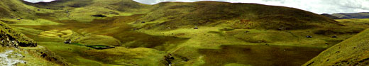 約莫二十分鐘後,我們終於一邊登上山坡頂上一邊驚嘆,因為呈現眼前的雪山,不再是剛剛山腳下被遮又被切得斷斷續續的雪山,在此平頂,我們一覽雪山無遺,雪山威領鮮活,雲在他身邊就像過動的孩童,翻騰變化;陽光像探照燈一般全力聚焦山頂,山腰陰在雲下,獨獨現出山頂白龍,倏地又以陰雲遮掩;而我們跟前看似較近的綠色弧坡草毯上,白色星點移動,猛然驚覺那正是數大的羊羣哪!就像綠絨毯上會移動的緹花,牠們的移動像是呼應雲朵,時而聚攏,時而動作迅速地從那一側的斜坡換到這一側的斜坡,沒有任何人發號施令,像訓練有術的羊,自行研發了多種緹花,不經意地為不速之客驚鴻瞥見。