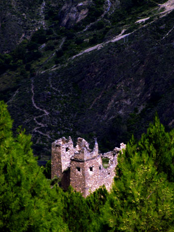 我們臨著沒有欄杆的路緣駐足下望,即可看見許多藏家,有些較古的藏寨看起來好似歐洲古堡,在綠林之間散發一股幽遠神秘;嘉絨藏寨的建築特色是──屋頂的四角會豎起白色三角形的裝飾,大概也是因為如此,所以遠遠看去讓人錯覺是歐洲古堡的城垛,藏寨的頂樓通常都是通風良好的曬穀場,除了玉米外,紅紅的辣椒成串吊在簷下,讓整個寨子豔光鮮活。丹巴藏民與其他地方藏民的差異是,與漢人一樣靠農耕為主,而且海拔僅